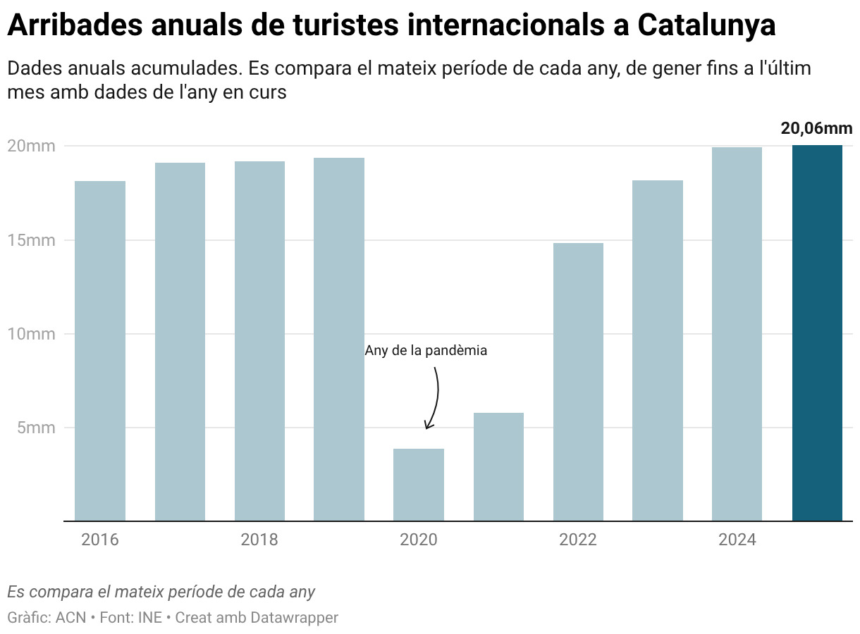 ACN Barcelona – Catalunya va rebre 20.055.314 turistes internacionals durant el 2025 i va assolir un nou màxim de la sèrie històrica, segons les dades de l’Institut Nacional d’Estadística (INE). Així, per primera vegada es va superar la barrera dels 20 milions de visitants i es va millorar en un 0,6% la xifra de l’any anterior (19.940.217). Cada turista es va gastar de mitjana 221 euros al dia, un 4,2% més que l’any anterior (211 euros) i de mitjana va quedar-se 5,59 dies, lleugerament per sota de l’any anterior (5,63 dies). És a dir, els turistes es van estar menys dies a Catalunya, però van gastar més. A l’Estat, el 2025 també va tancar amb un rècord històric de turistes estrangers i es van fregar els 96,8 milions, un 3,7% anual més.