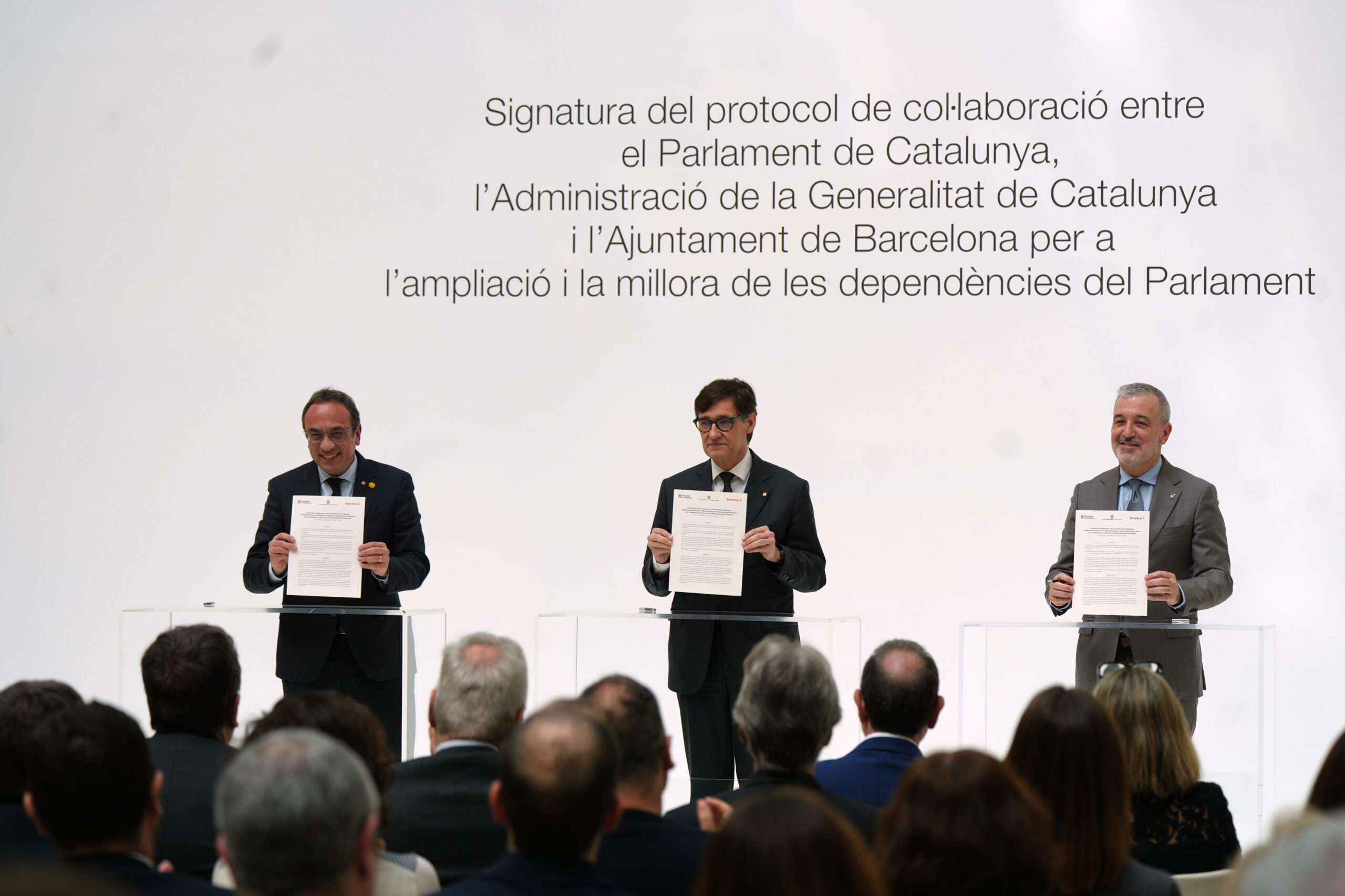 ACN Barcelona – L’ampliació del Parlament de Catalunya es farà a les actuals cavalleries de la Guàrdia Urbana, en un edifici situat “a tres minuts” del Palau del Parlament i amb un potencial d’uns 8.000 metres quadrats. El president de la cambra, Josep Rull, l’alcalde de Barcelona, Jaume Collboni, i el president de la Generalitat, Salvador Illa, han signat aquest dimarts el protocol de col·laboració que ha de permetre tirar endavant l’operació. Rull ha defensat que el projecte ha de servir per tenir un Parlament del segle XXI “obert, operatiu i útil”; Collboni ha reivindicat que Barcelona “exerceix plenament la seva responsabilitat com a capital del país” cedint l’espai, i Illa ha emmarcat l’acord en una “Catalunya d’entesa” i de “consensos”.