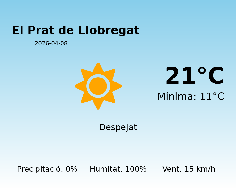 En resum, el Prat de Llobregat experimentarà avui un dia assolellat i sec amb temperatures agradables, tot i que amb una humitat elevada. Prepara’t per gaudir del bon temps, independentment de les activitats que tinguis planejades.