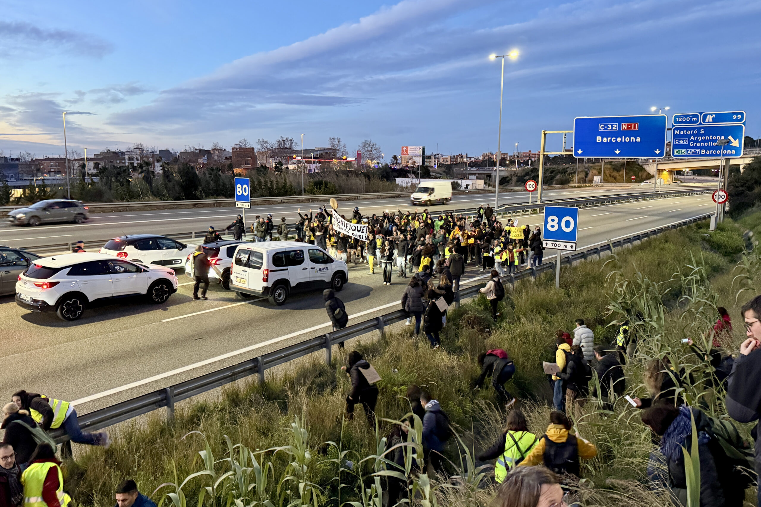 ACN Mataró – Més d’un centenar de professors en vaga han tallat aquest dimecres cap a dos quarts de vuit la C-32 a Mataró, en direcció Barcelona i en plena hora punta. El tall ha durat mitja hora, fins a les vuit del matí. Els Mossos d’Esquadra havien muntat un ampli dispositiu per impedir-ho amb vehicles dels antiavalots a tots els accessos i s’han viscut moments de tensió amb cops de porra dels agents cap als manifestants per evitar que ocupessin la via. Els mestres han saltat finalment per un terraplè per accedir-hi i portar a terme l’acció de protesta que planejaven. La policia els ha acabat encapsulant per dirigir-los cap a una de les sortides de l’autopista i poder alliberar l’autopista. En acabar el tall, la marxa segueix pels carrers de Mataró.