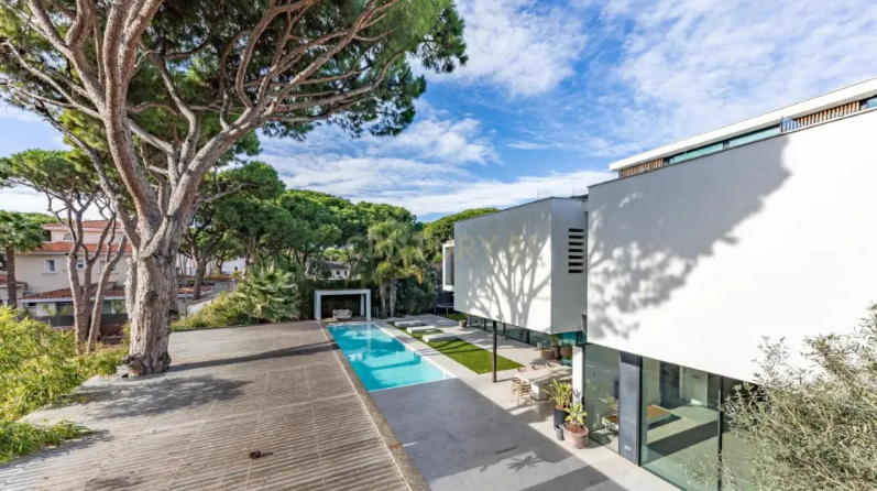 A l’exterior, el jardí s’ha organitzat com un veritable oasi privat amb piscina, zona de descans i un bar exterior totalment equipat, ideal per a reunions socials i activitats durant l’estiu. Aquest espai exterior, juntament amb la proximitat de la platja i la tranquil·litat de l’entorn, converteixen la mansió en un lloc molt desitjat per a famílies de perfil alt.