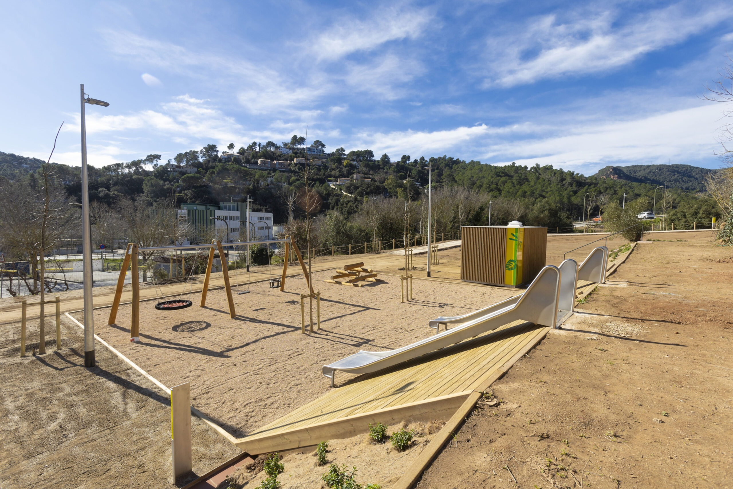 L’actuació inclou una àrea de jocs infantils i al costat el mòdul de Naturaula, destinat a activitats educatives. Des del punt inferior del parc arrenca un camí perimetral de 200 metres, de formigó, amb pendent constant que no supera el 6% i amb enllumenat per garantir l’accessibilitat, que connecta amb les diferents plataformes del terreny i amb el torrent.