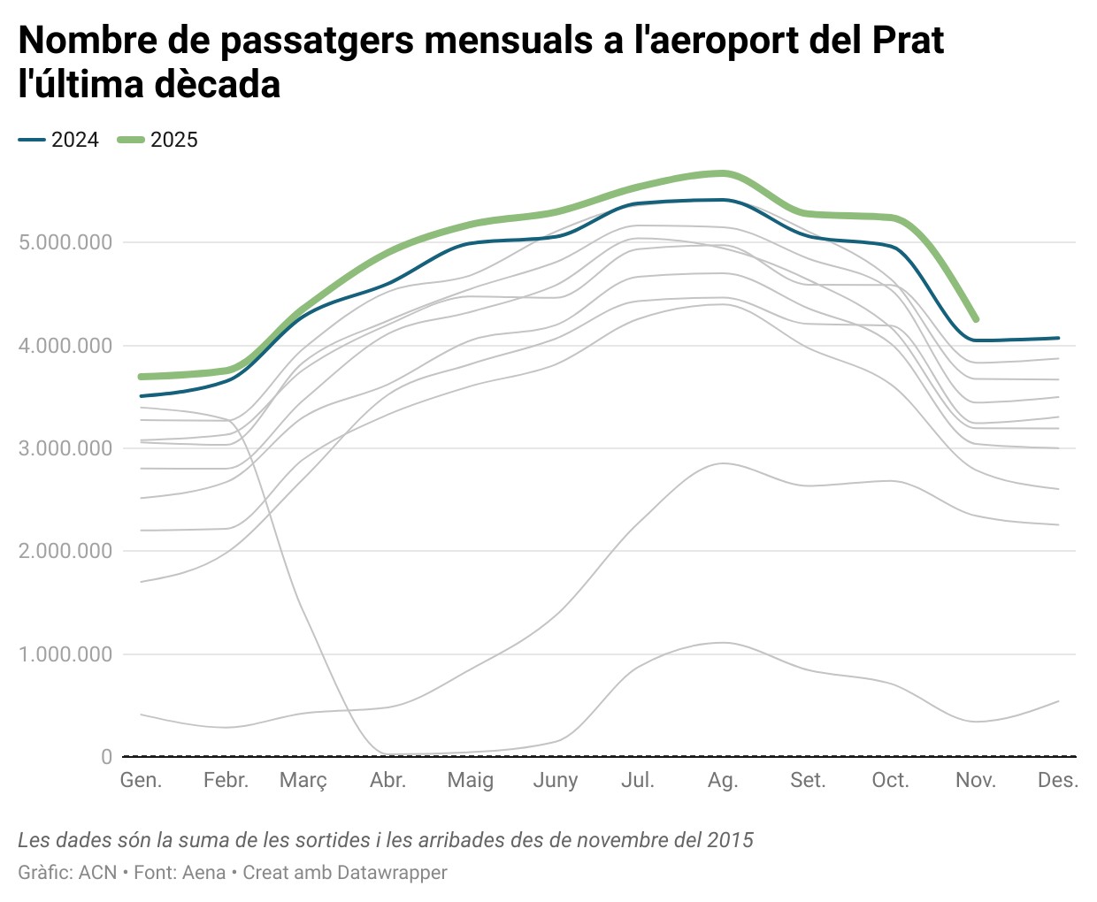 ACN Barcelona – L’aeroport del Prat va superar els 4,2 milions de passatgers el mes de novembre, segons les dades publicades aquest divendres per AENA. La xifra suposa un nou màxim històric per aquest mes, i representa un augment del 5,1% en relació amb el novembre de l’any passat. En els primers onze mesos de l’any, l’aeroport de Barcelona ha superat els 53 milions de passatgers, un 4,3% més que entre el gener i el novembre del 2024. Del total de passatgers, la immensa majoria eren comercials i, d’aquests, 3,1 milions van viatjar en vols internacionals, un 6,8% més que en el mateix mes del 2024. Un total de 1.070.834 passatgers van fer vols nacionals, un 0,6% més.