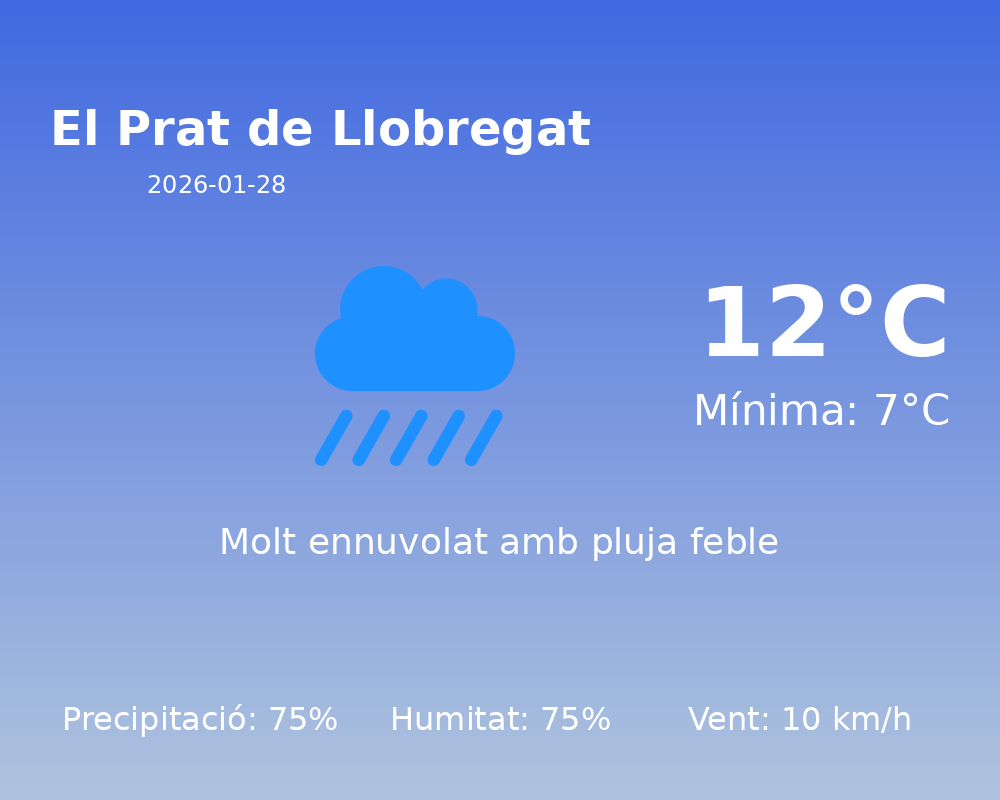 Avui, El Prat de Llobregat serà testimoni d’un dia predominantment ennuvolat amb possibilitats de precipitacions significatives. La humitat relativa es mantindrà al voltant del 75%, fet que contribuirà a la sensació d’humitat al llarg del dia.