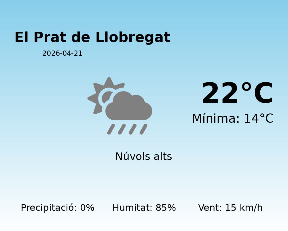 Avui, a El Prat de Llobregat, es preveu un dia estable amb temperatures agradables. La temperatura màxima arribarà als 22 graus mentre que la temperatura mínima es mantindrà als 14 graus. Aquestes condicions permetran gaudir d’una jornada primaveral molt típica, ideal per activitats a l’aire lliure.