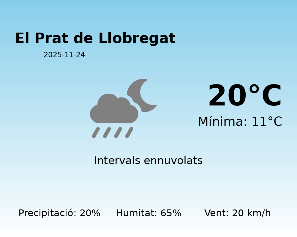 Avui, la localitat d’El Prat de Llobregat experimentarà temperatures bastant agradables per a aquesta època de l’any. La temperatura màxima arribarà als 20°C, mentre que la mínima caurà fins als 11°C. Això suposa un rang tèrmic moderat, ideal per activitats a l’aire lliure si les condicions ho permeten.