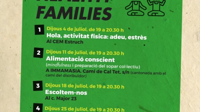 Les sessions, que s’impartiran els dijous de juliol, seran gratuïtes i es realitzaran en diversos espais del municipi. Cada sessió està dissenyada per treballar aspectes com l’activitat física, l’alimentació conscient, la comunicació familiar o les dinàmiques de grup que fomentin el benestar familiar.